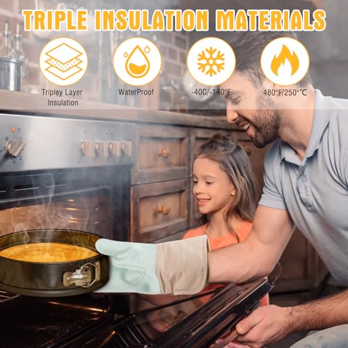 Guanti da forno premium set di 6:Include 2 guanti da forno, 1 paio di mini guanti da forno, 1 presina e 1 pennello per salse. Questi guanti da forno estesi (33cm/13 “) forniscono una protezione extra per le braccia da scottature dovute a fiamme e vapore caldo1 paio di guanti da forno piccoli e antiscivolo sono molto comodi per maneggiare la piastra calda, il coperchio della pentola e la friggitrice ad aria. Il presina in silicone protegge il piano del tavolo da pentole o padelle calde.