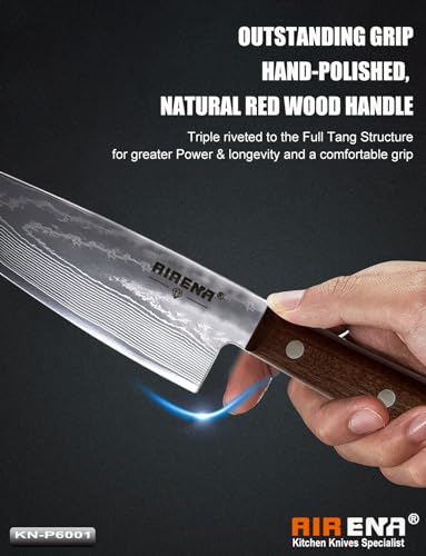 ✅ 【 PRESA ECCEZIONALE 】 – Tripla rivettatura sul manico in legno per maggiore potenza e longevità. La struttura Full-Tang, che è diversa dal manico di saldatura del coltello da chef generale, non si romperà dopo un uso a lungo termine. Impugnatura ergonomica e antiscivolo, distribuzione bilanciata del peso della lama, è facile da controllare durante il taglio e un taglio senza fatica, e puoi goderti totalmente ogni momento di taglio e cottura in relax con i coltelli da cucina AIRENA.