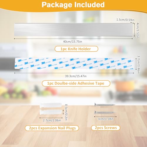 Barra magnetica per coltelli da 40cm: Riceverete un portacoltelli magnetico lungo 40 cm + nastro biadesivo + viti. Ci sono due modi per installare il porta coltelli magnetico. Metodo 1: utilizzare direttamente il nastro biadesivo per attaccarlo nella posizione desiderata (è necessario pulirlo e tenerlo asciutto), attendere 48 ore e poi è possibile utilizzarlo. Metodo 2: è possibile utilizzare le viti per fissarlo nella posizione desiderata. Due metodi di montaggio da scegliere!