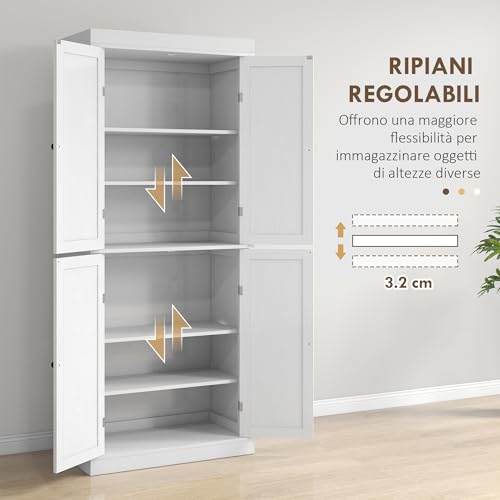 HOMCOM Mobile Cucina Alto con 6 Ripiani e 2 Ante, Armadio Dispensa con Ripiani Regolabili in Legno, 76×40.5×184 cm, Bianco