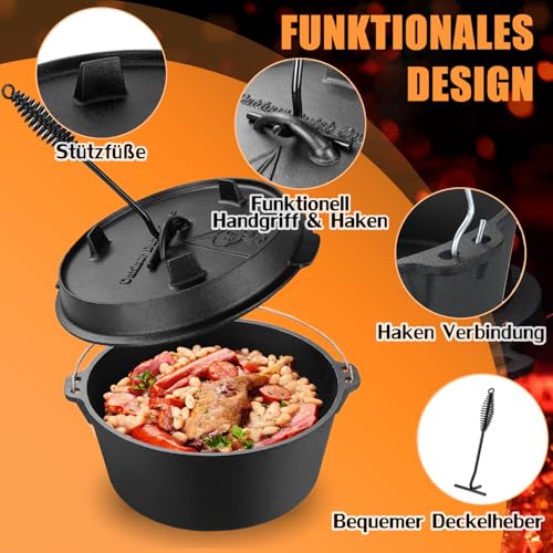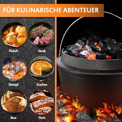 Pratici accessori: oltre al forno olandese da campeggio all’aperto, il nostro prodotto include un sollevatore per coperchio, con il quale è possibile sollevare il coperchio in modo sicuro e semplice. Il manico in filo metallico permette a questo Dutch oven di appendere un fuoco aperto, ma funge anche da maniglia di sicurezza, rendendo il Dutch oven più flessibile e sicuro da usare