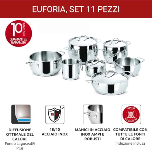 Lagostina Euforia Set di Pentole Induzione, Gas e Forno in Acciaio Inox 18/10, 11 Pezzi, Fondo Lagoseal Plus, Batteria di Pentole con 4 Casseruole, 2 Pentole, Bollilatte, 4 Coperchi