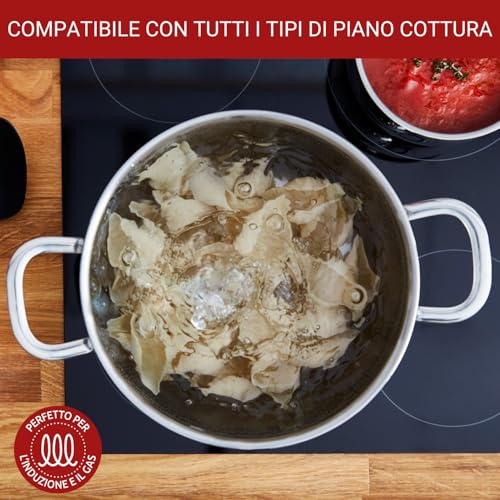 PER INDUZIONE, GAS E FORNO: Il fondo Lagoseal Plus in alluminio ad alto spessore racchiuso tra due strati di acciaio permette al calore di diffondersi in modo rapido e uniforme; è adatto a tutti i piani di cottura, induzione inclusa, e al forno fino a 180° C