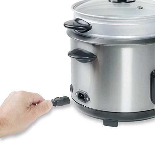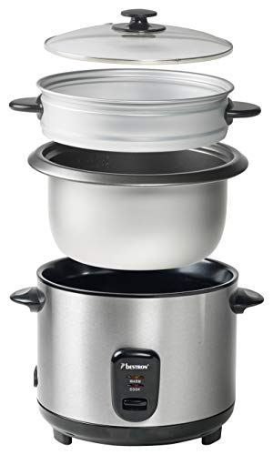 Contenuto: 1 Bestron Pentola cuociriso con inserto per cottura a vapore, coperchio, misurino, paletta per riso, Potenza: 700 W, Capacità: 1,8 l, Materiale: Acciaio/Plastica, Dimensioni: 32,8x27x30 cm, Peso: 2,4 kg, ARC180