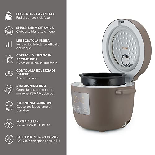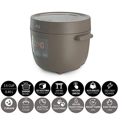 Yum Asia Tsuki mini cuociriso con ciotola in ceramica Shinsei (2,5 tazze, 0,45 litri) 5 funzioni di cottura del riso, 2 funzioni multicooker, display a LED nascosto, 220-240V (Pebble Grey)
