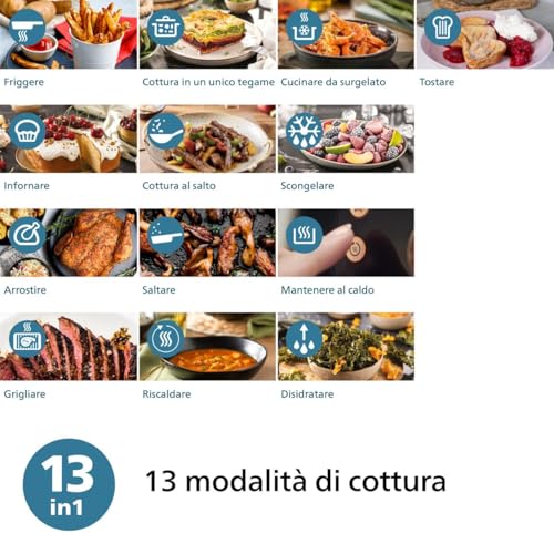 COTTURA 13 IN 1: Frittura ad aria, cuoci al forno, griglia, arrostisci e altro ancora. Imposta manualmente tempo e temperatura o usa i programmi preimpostati per riscaldare, scongelare e mantenere al caldo in modo facile