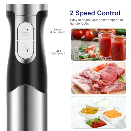 Potenza potente: 1200 watt di potenza, velocità variabile e funzione di turbocompressione, forniscono una potenza potente per rendere il cibo più delicato, un mixer manuale intelligente adatto per mescolare, macinare, tritare, tritare e montare, può portarti macedonia, verdure Succhi, frullati, frullati e pappe