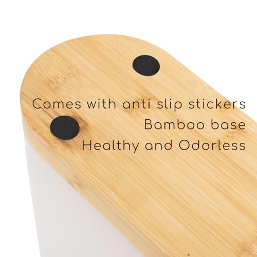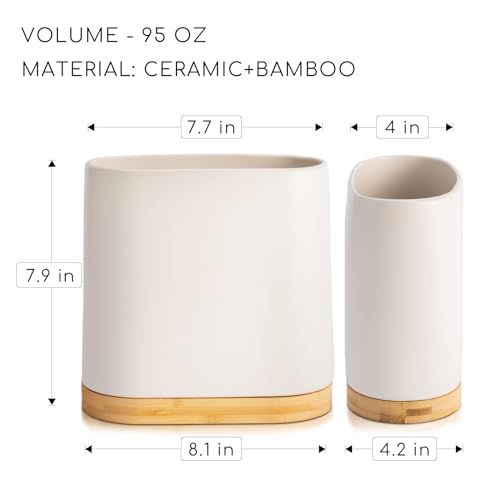 Costruzione: ceramica solida e fondo in bambù. La base in bambù è incollata alla parte superiore in ceramica. Porta utensili da cucina con fondo antiscivolo e cuscinetti antiscivolo. 10,2 cm di larghezza x 20 cm di lunghezza x 20 cm di altezza. Volume 85 once o 2,3 litri.