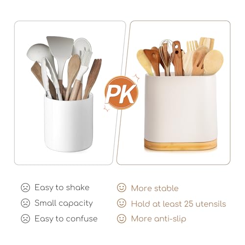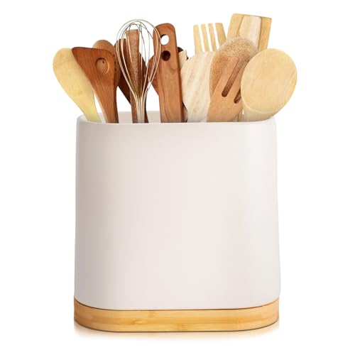 Grande portautensili in ceramica per piano di lavoro, porta utensili da cucina con base in legno di bambù, facile da pulire, portautensili da cucina, per spatole e cucchiai (bianco)