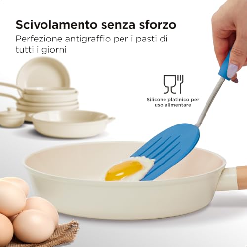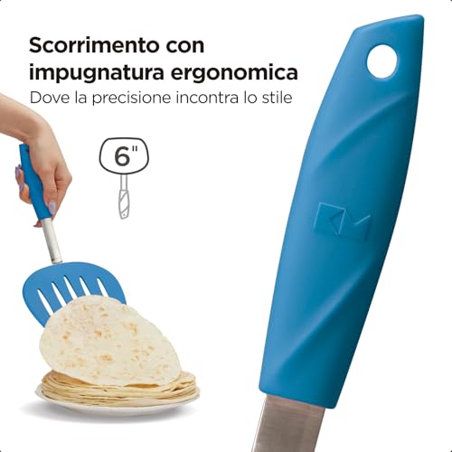 Servizio preciso e senza sforzo: la nostra spatola presenta un design con bordo affusolato, che consente di scivolare senza problemi sotto il cibo. La superficie perforata evita che il cibo si attacchi durante la cottura e consente di trasferirlo dalla padella al piatto con un unico movimento. Mantieni i tuoi pancake e altri piatti intatti e perfetti con Kitchen Mama