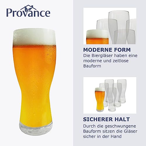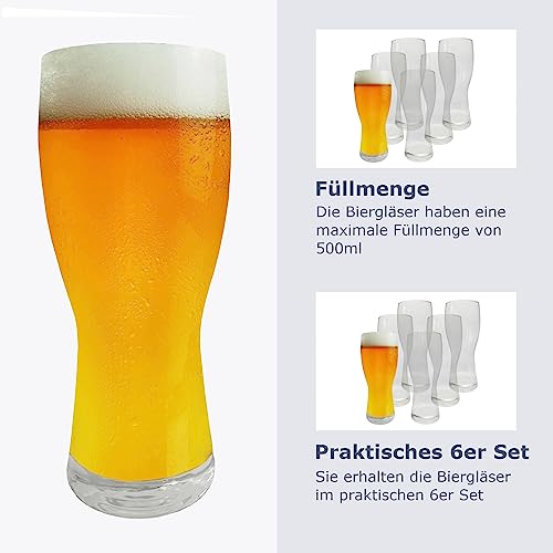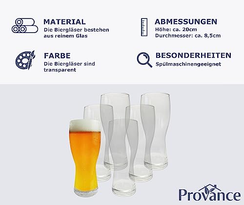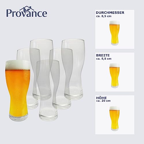 Provance 6 bicchieri da birra in vetro da 500 ml, 0,5 litri, lavabili in lavastoviglie, diametro 8,5 x 20 cm, senza trattino, design senza tempo, vetro trasparente