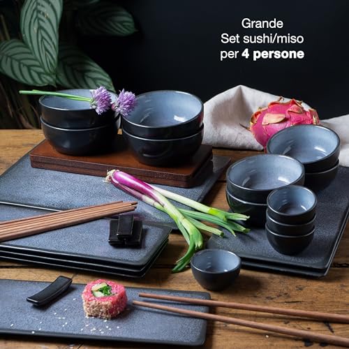 SET COMPLETO – Set di piatti per sushi Moritz & Moritz nero-blu per 4 persone: con 4 paia di bacchette, 4 porta bacchette, 4 ciotoline per salse, 4 ciotole da immersione per zenzero e wasabi, 4 ciotole per miso, 1 piatto grande da portata per sushi, 2 piatti piccoli da portata per sushi e 4 piatti da sushi