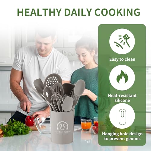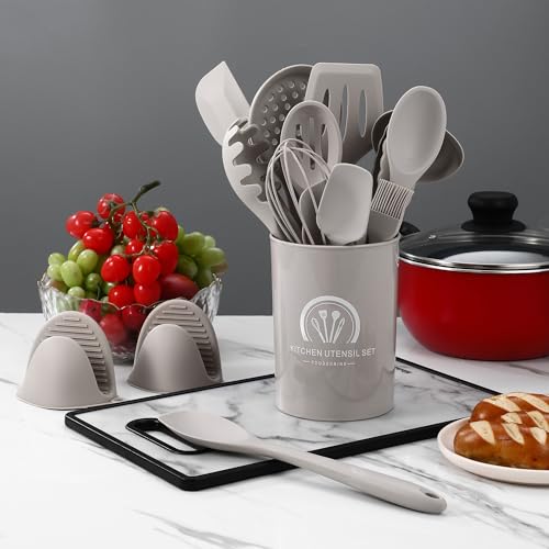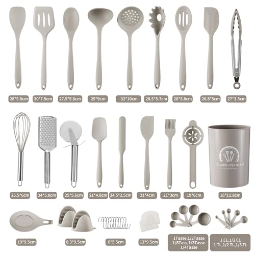Set Utensili Cucina Silicone da 43 Pezzi. Set Mestoli Cucina Silicone è resistente alle alte temperature e antiaderente. Set Cucina Utensili color Kaki, lavabile in lavastoviglie