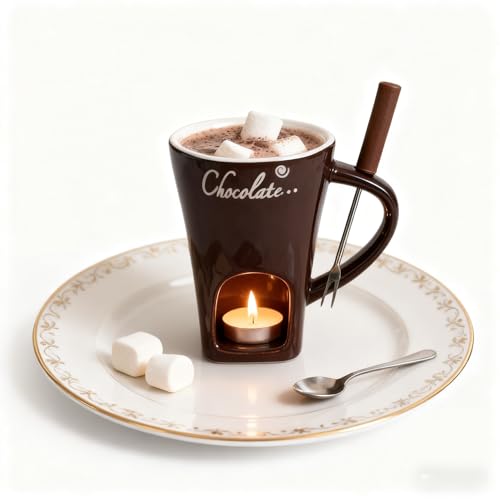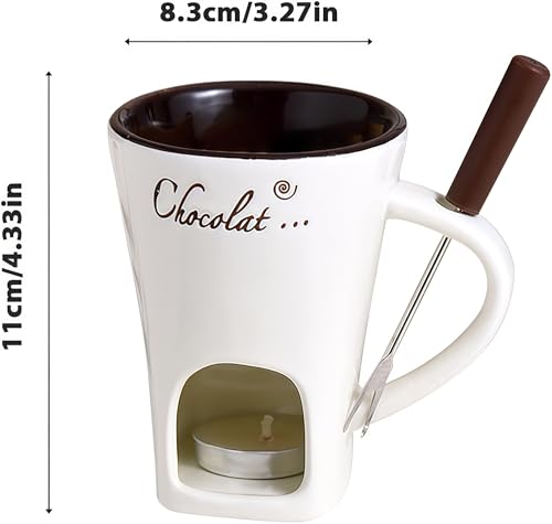 Generico Chocolate Fondue Mug, Ceramic Melting Pot with Fork, Personal Tealight-Heated Chocolate & Cheese Warmer, Dishwasher-Safe, 200 ml / 6.8 fl oz (Candle Not Included)(Brown)